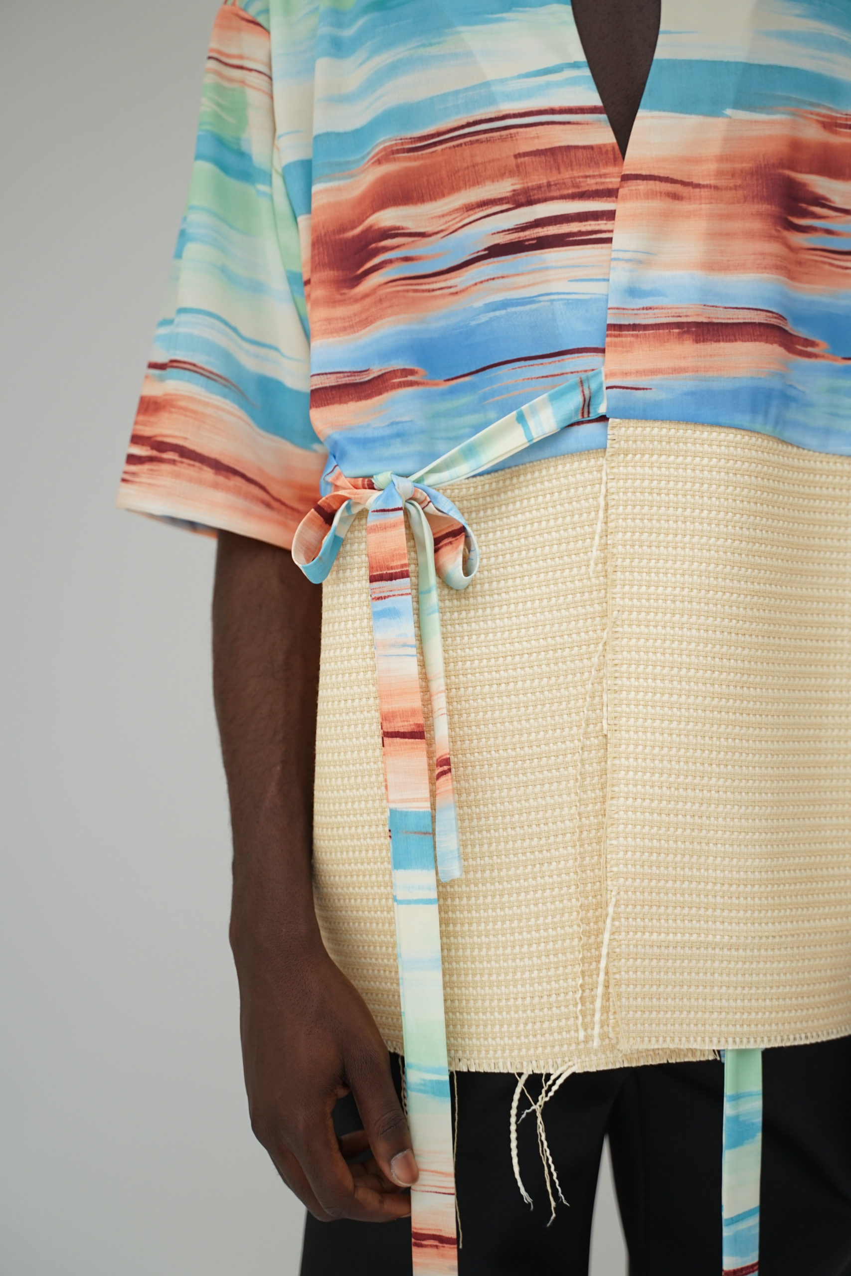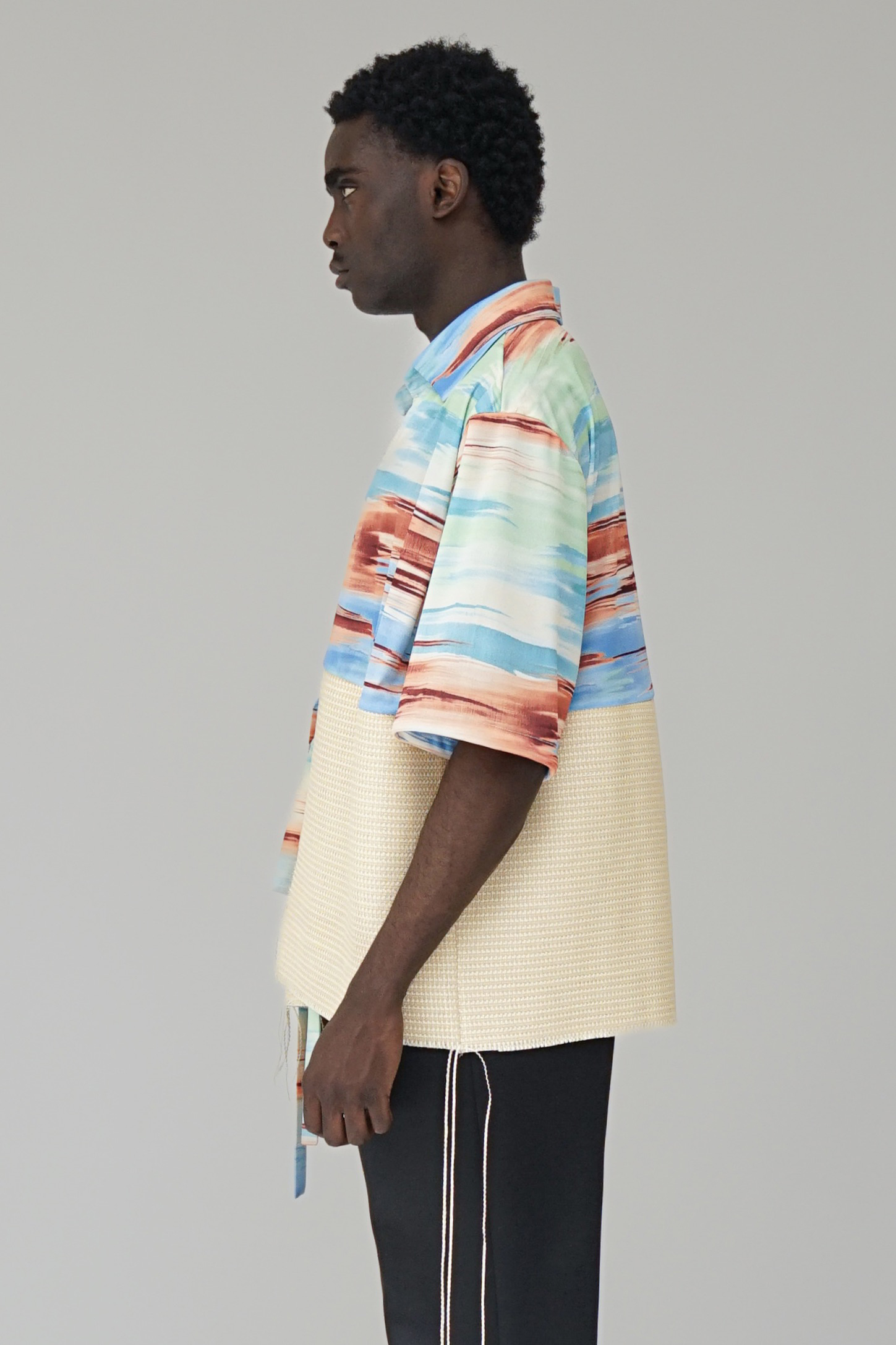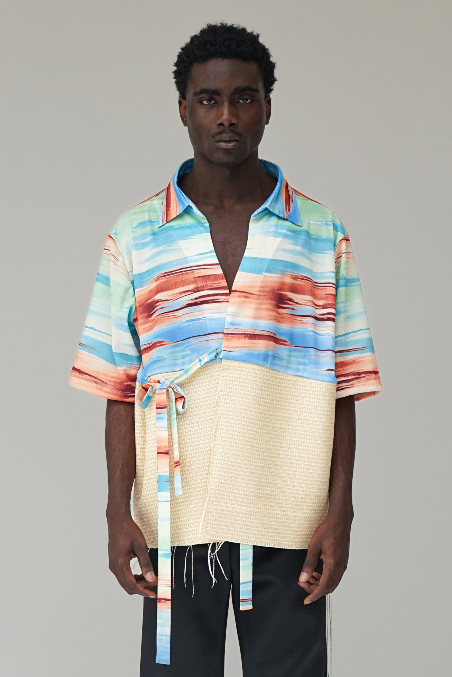 Chemise manche courte avec fermeture par fil intérieur et extérieur.