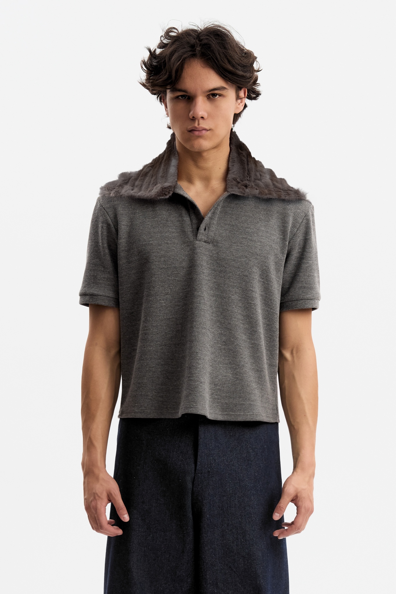 Fourrure amovible. Se fixe au polo crop (vendu séparément) grâce à des boutons pression. Ajoute une touche unique et chaude à la pièce.
